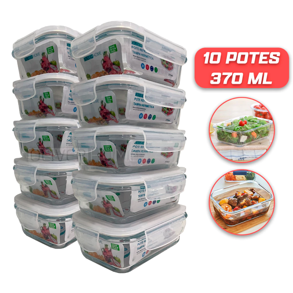 Kit 10 Potes de Vidro 370ml Hermético Marmita Fit com Tampa 4 Travas