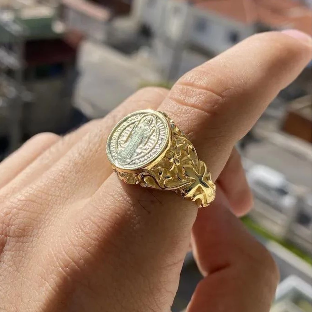 Anel Masculino De Ouro São Bento Com Cruz Lateral Banhado a Ouro